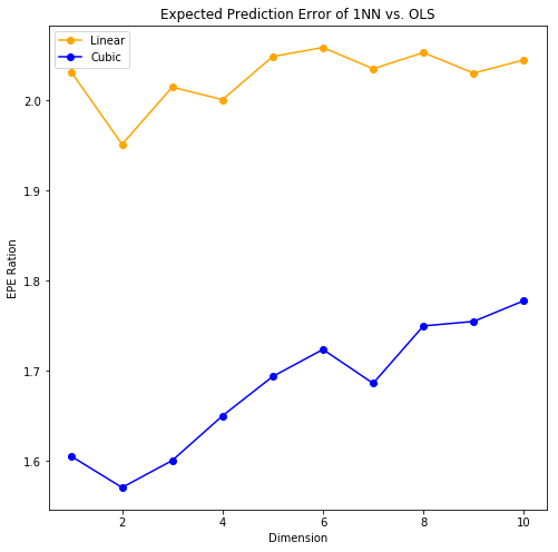 where \(\varepsilon \sim N(0, \sigma^2)\) and we fit the model by least squares to the training data. For a test point \(x_0\) we have \(\hat{y_0}=x_0^T\hat{\beta}\) which can be written as \(\hat{y_0} = x_0^T\beta + \sum_{i=1}^N {l_i(x_0)\varepsilon_i}\) where \(l_i(x_0)\) is the \(i\)th element of \(\mathbf{X}(\mathbf{X}^T\mathbf{X})^{-1}x_0\)